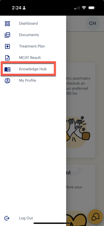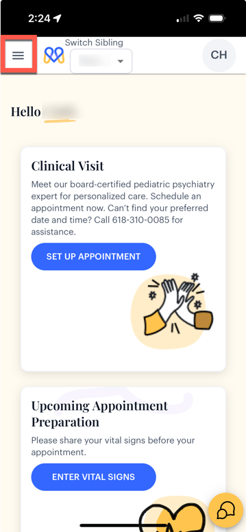 - Log in to your MindWeal account. Click the three horizontal lines in the top left corner to open the menu.