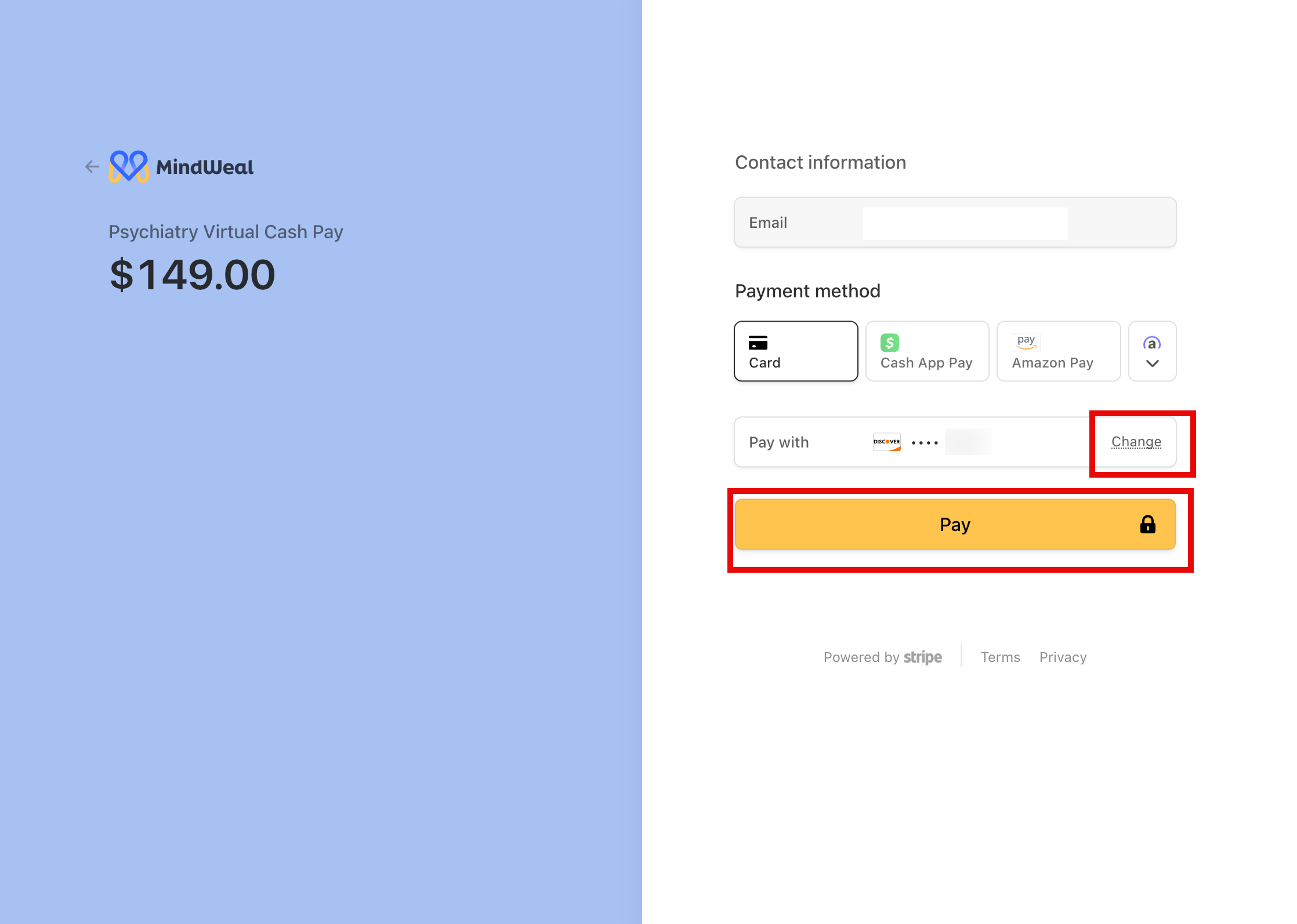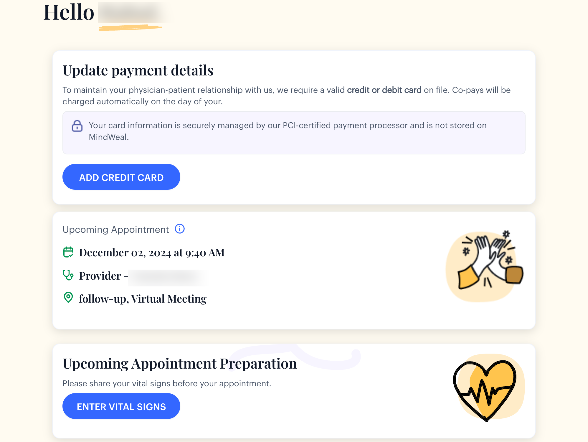 Once your account is activated, please add a credit or debit card to your profile. This is required for out-of-pocket (cash pay) visits. MindWeal securely manages your card information through Stripe, a trusted PCI-compliant payment vendor.