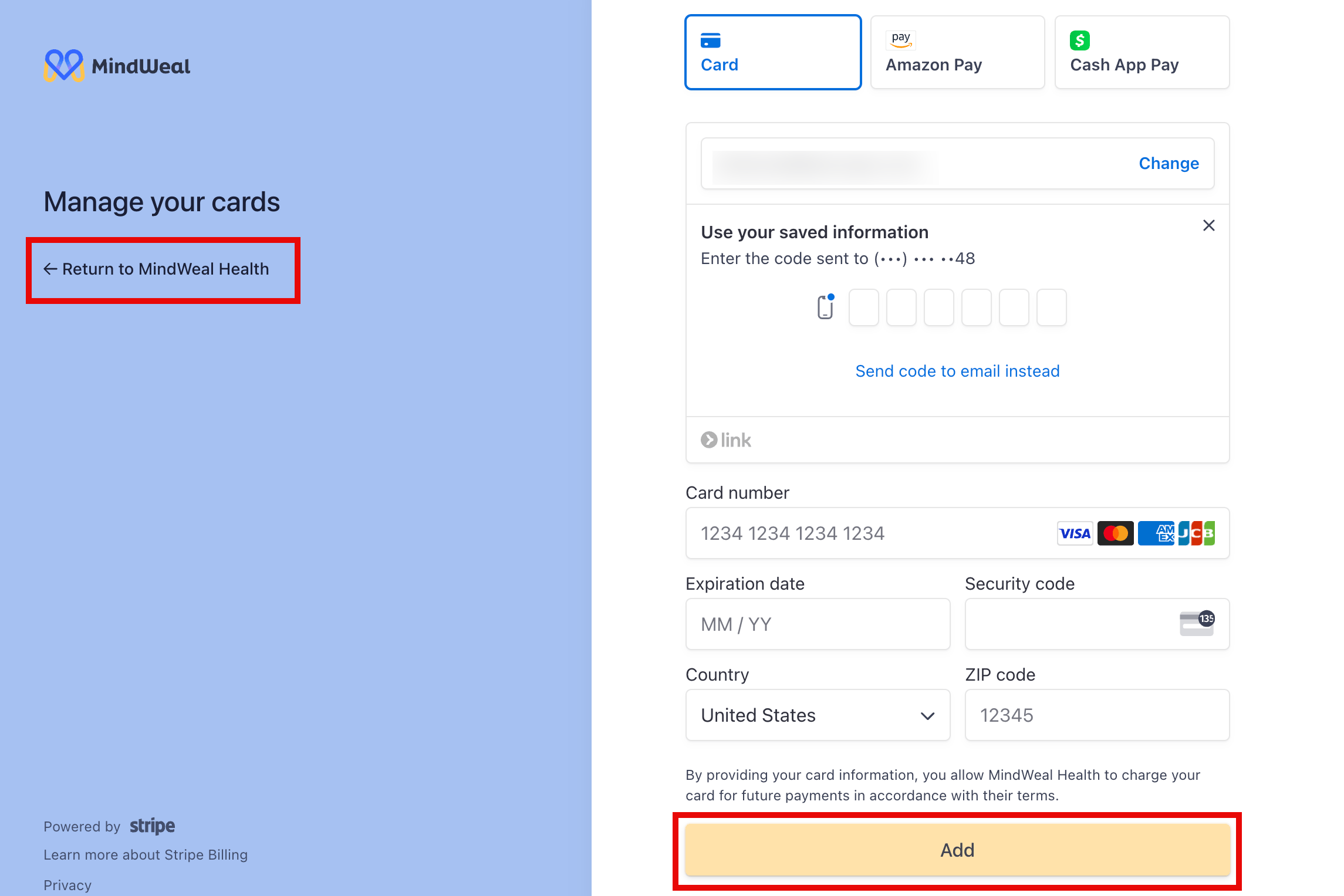 - This will take you to Stripe Portal. Enter your card details in the Stripe portal, then click "Add" and after that "Return to MindWeal Health" . Note: MindWeal does not store your credit card details—Stripe securely handles this.