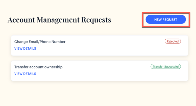 - A window will appear showing the history of your previous account management requests. Click "New Request."