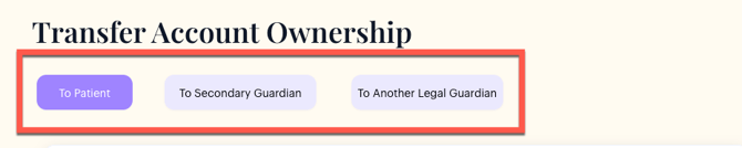 - A form will appear, as shown in the image. Select whether you wish to transfer ownership to Patient (only allowed if patient is 18 years and older and is their own guardian), to secondary guardian or to another legal guardian.