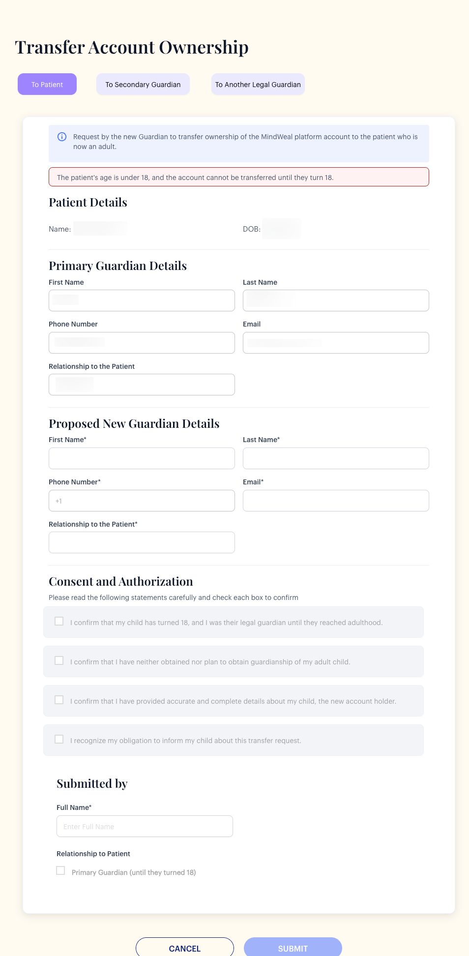 - Once the new guardian completes the online form, it will be received by the MindWeal HelpDesk and reviewed by our Managers. The Manager will ensure that the new guardian is prepared to accept the role of primary guardian and its responsibilities before initiating the account transfer.