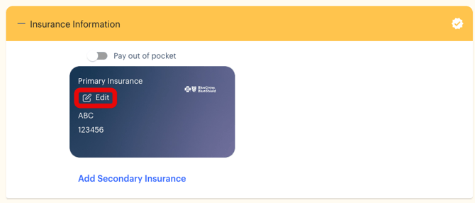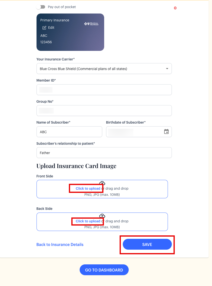 - Enter updated insurance details and upload photos of the front and back of your insurance card. Click "Save" to confirm your changes.